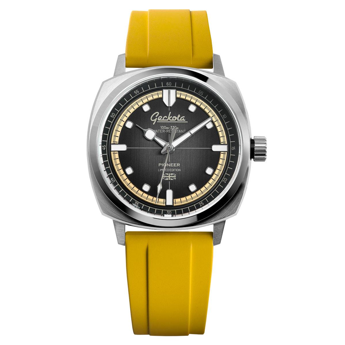 The polished hour and minute hands are also treated with BGW9 for nighttime visibility, while the fume dials bring a pop of colour and contrast. Encased by a bevelled and polished fixed bezel, the Pioneer exudes a refined balance of sportiness and elegance.